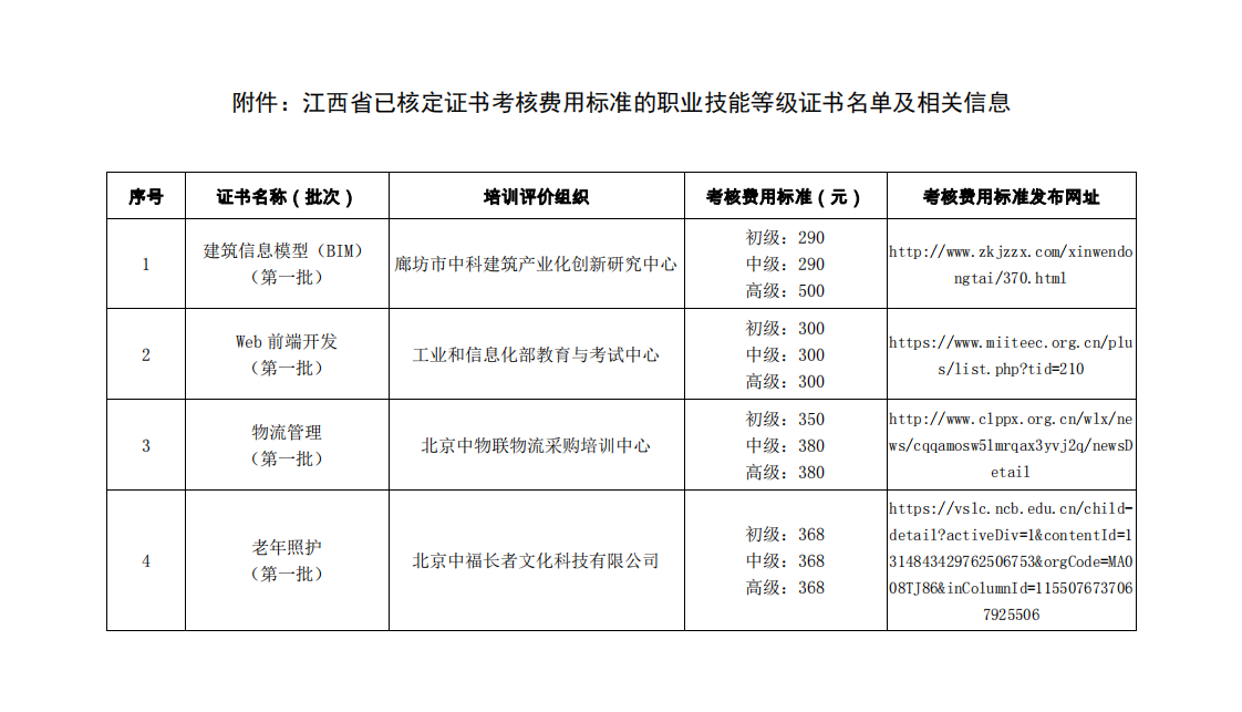 為貫徹落實(shí)教育部關(guān)于在院校實(shí)施“學(xué)歷證書+若干職業(yè)技能等級(jí)證書”制度試點(diǎn)有關(guān)文件精神和工作部署,江西積極推動(dòng)各職業(yè)院校和培訓(xùn)評(píng)價(jià)組織依據(jù)《江西省在職業(yè)院校實(shí)施的職業(yè)技能等級(jí)證書考核費(fèi)用標(biāo)準(zhǔn)核定工作方案》(贛教職成辦函〔2020〕11號(hào))開(kāi)展職業(yè)技能等級(jí)證書考核費(fèi)用標(biāo)準(zhǔn)核定工作。日前,模型(BIM)、Web前端開(kāi)發(fā)、物流管理等78個(gè)職業(yè)技能等級(jí)證書考核費(fèi)用標(biāo)準(zhǔn)(江西)陸續(xù)向社會(huì)發(fā)布。