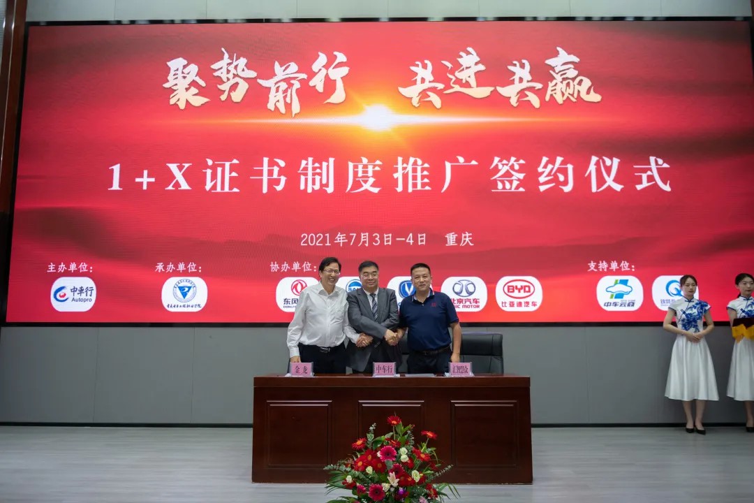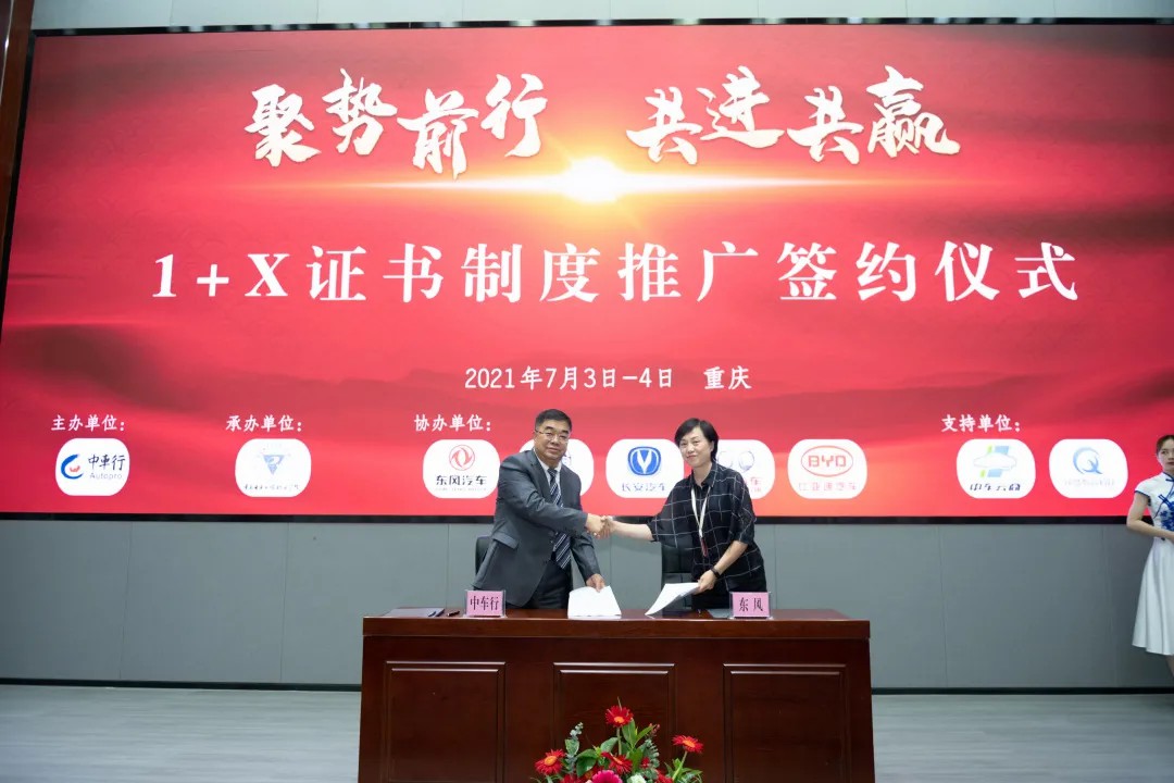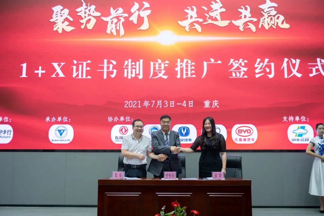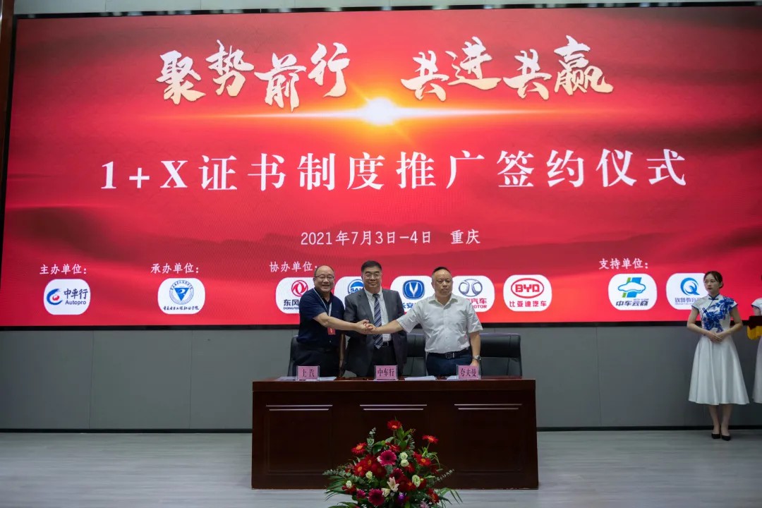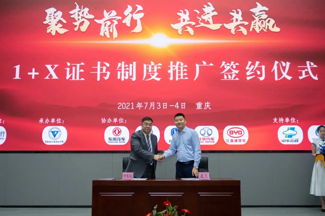 7月3日-4日,北京中車行高新技術(shù)有限公司1+X證書(shū)制度汽車運(yùn)用與維修、智能新能源汽車職業(yè)技能等級(jí)證書(shū)試點(diǎn)工作總結(jié)交流會(huì)、暨中車行分別與東風(fēng)集團(tuán)、上汽集團(tuán)、長(zhǎng)安汽車、北京汽車、金龍汽車等五大汽車制造企業(yè)簽約儀式在重慶舉行。本次會(huì)議圍繞著如何深化產(chǎn)教融合、校企合作,推動(dòng)崗課賽證協(xié)同發(fā)展,共同研究探討了促進(jìn)汽車領(lǐng)域1+X職業(yè)技能等級(jí)證書(shū)制度落地生效的發(fā)展路徑。國(guó)內(nèi)汽車龍頭企業(yè)代表、知名行業(yè)專家及1+X優(yōu)秀試點(diǎn)院校領(lǐng)導(dǎo)、老師等300余人參會(huì)。